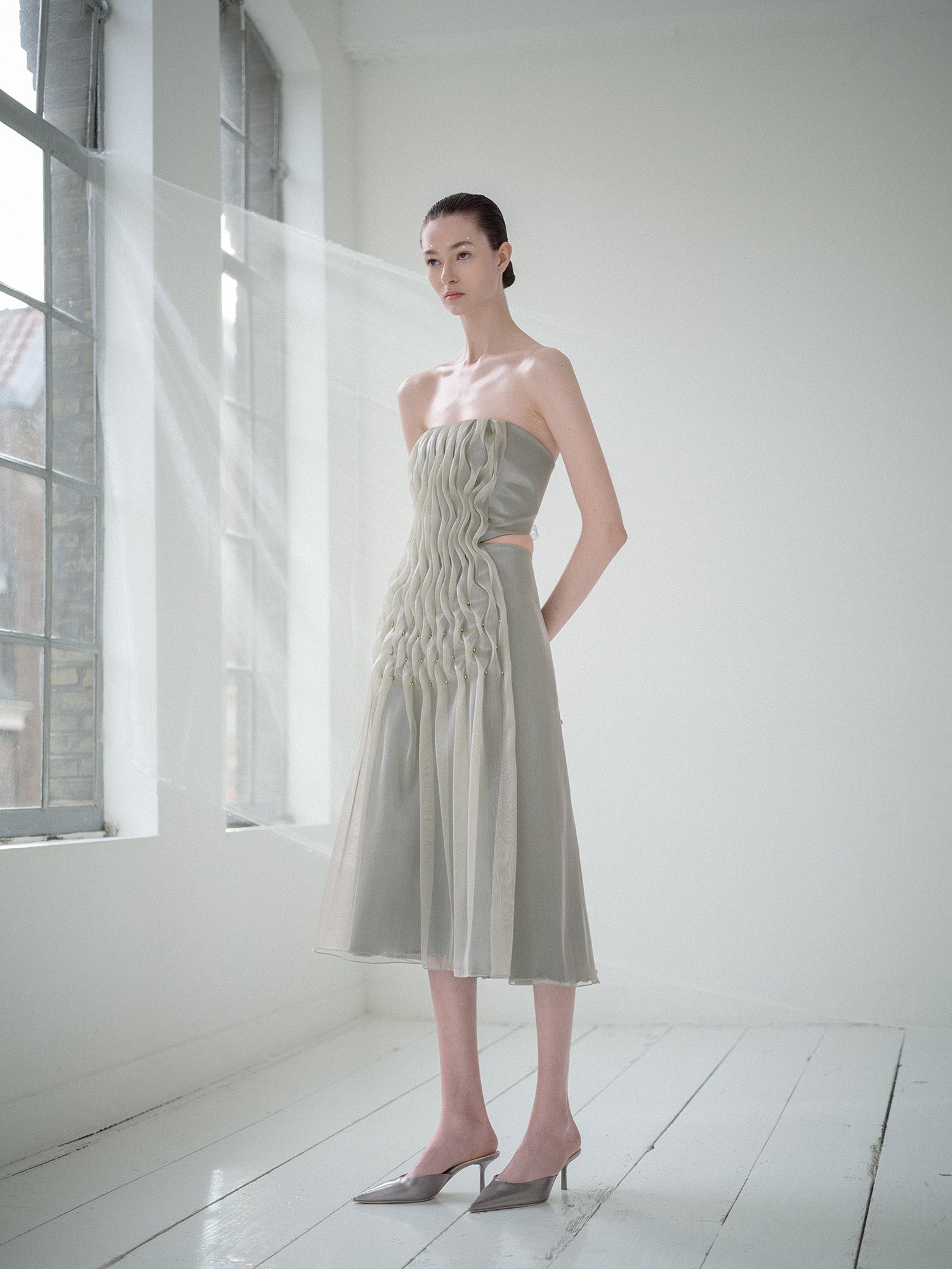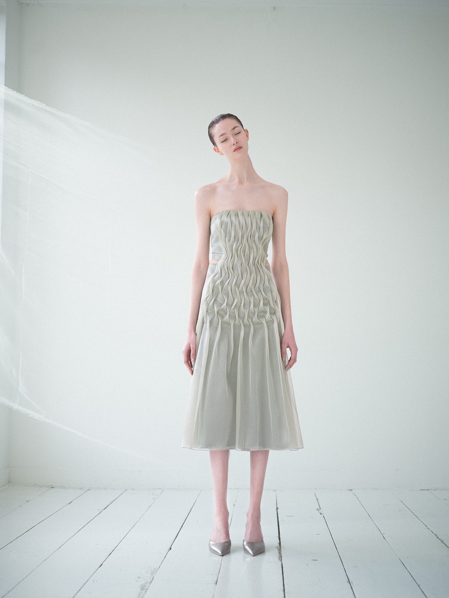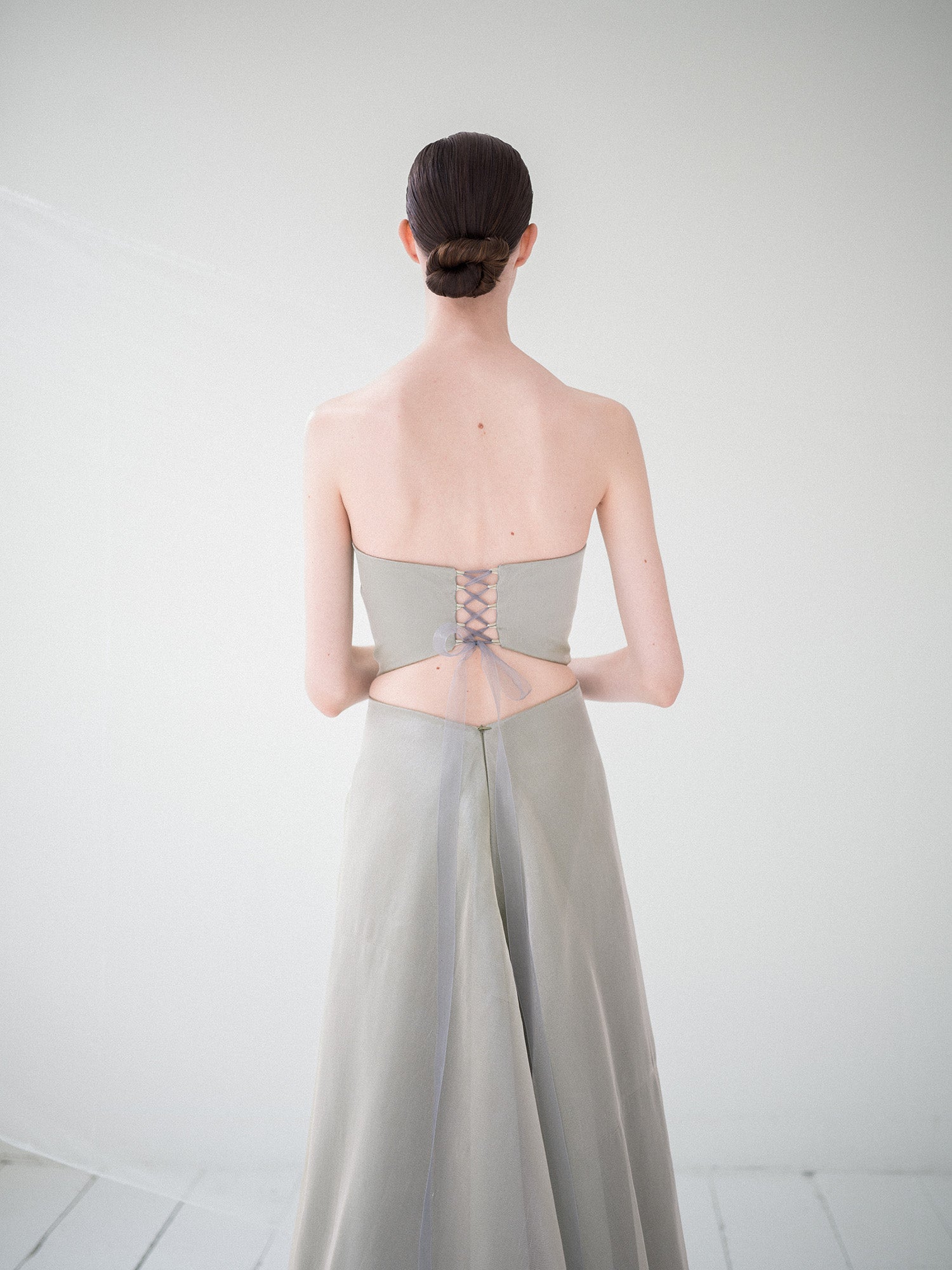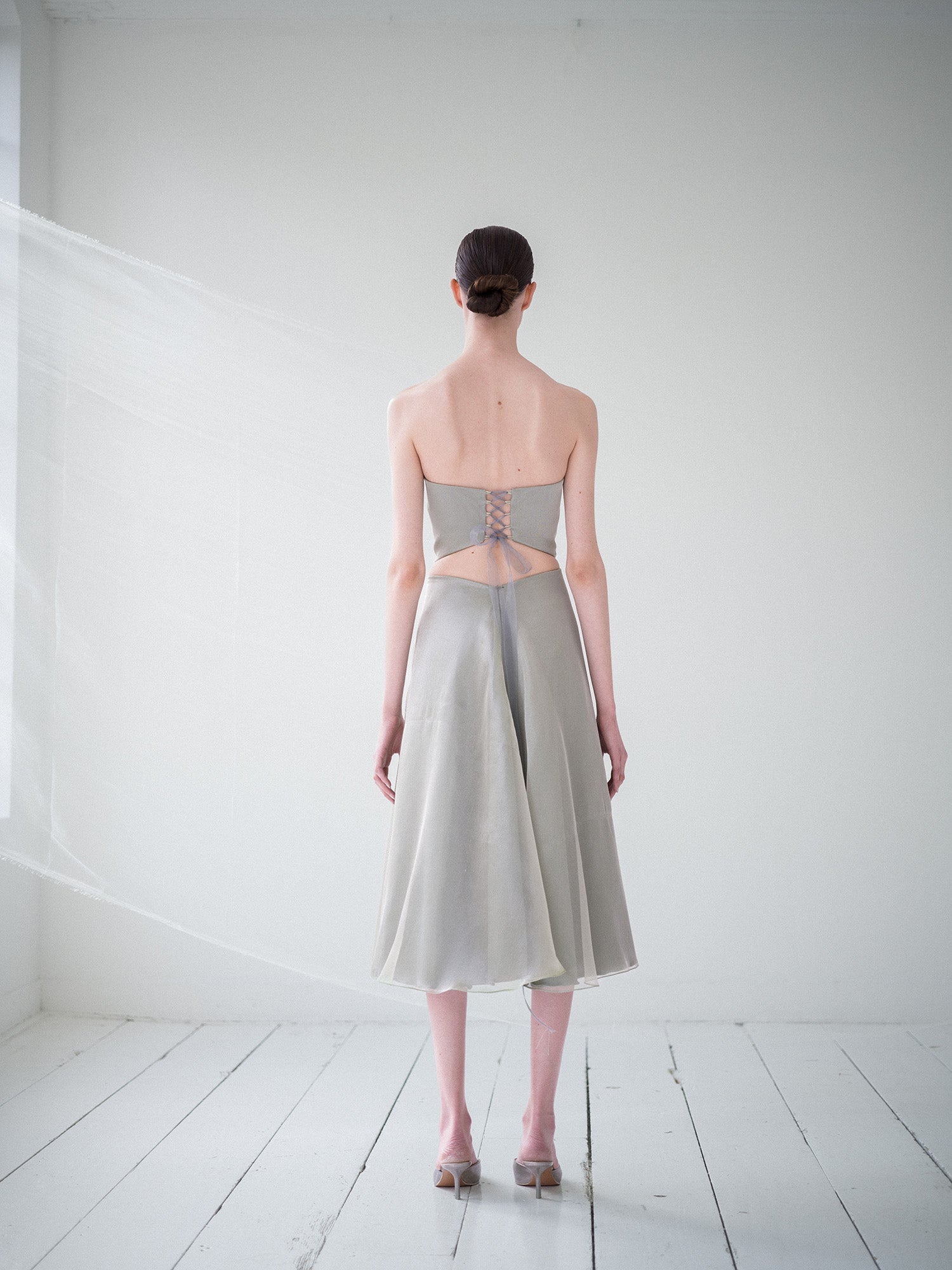Aqua – A timeless A-line dress crafted from three delicate layers: sheer silk organza, a superfine wool base, and a soft viscose lining for added comfort. Hand-stitched detailing along the center front adds a distinctive, subtle elegance. The open back, finished with adjustable laces, offers a flexible fit while enhancing the dress’s graceful silhouette. Light and refined, its airy design evokes effortless femininity.