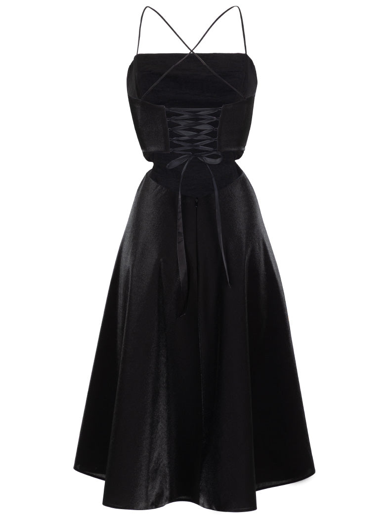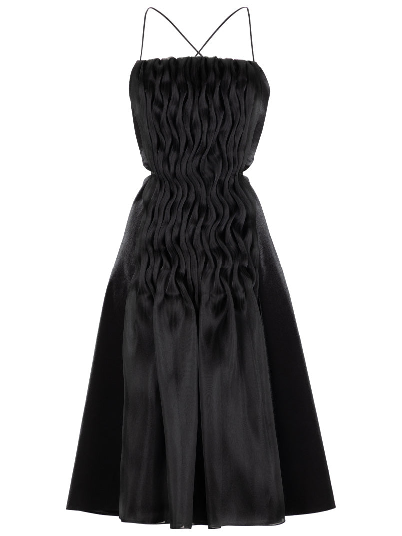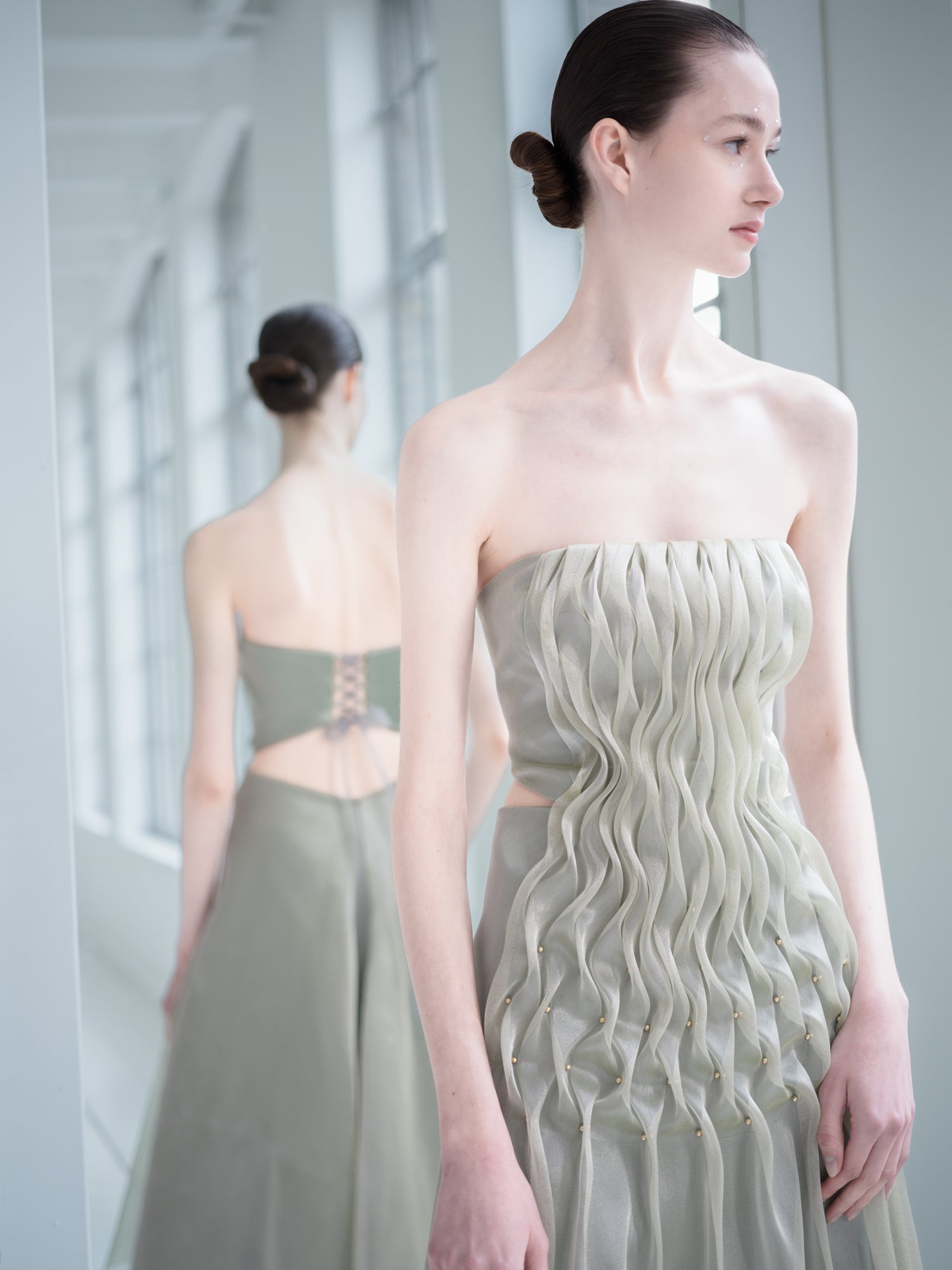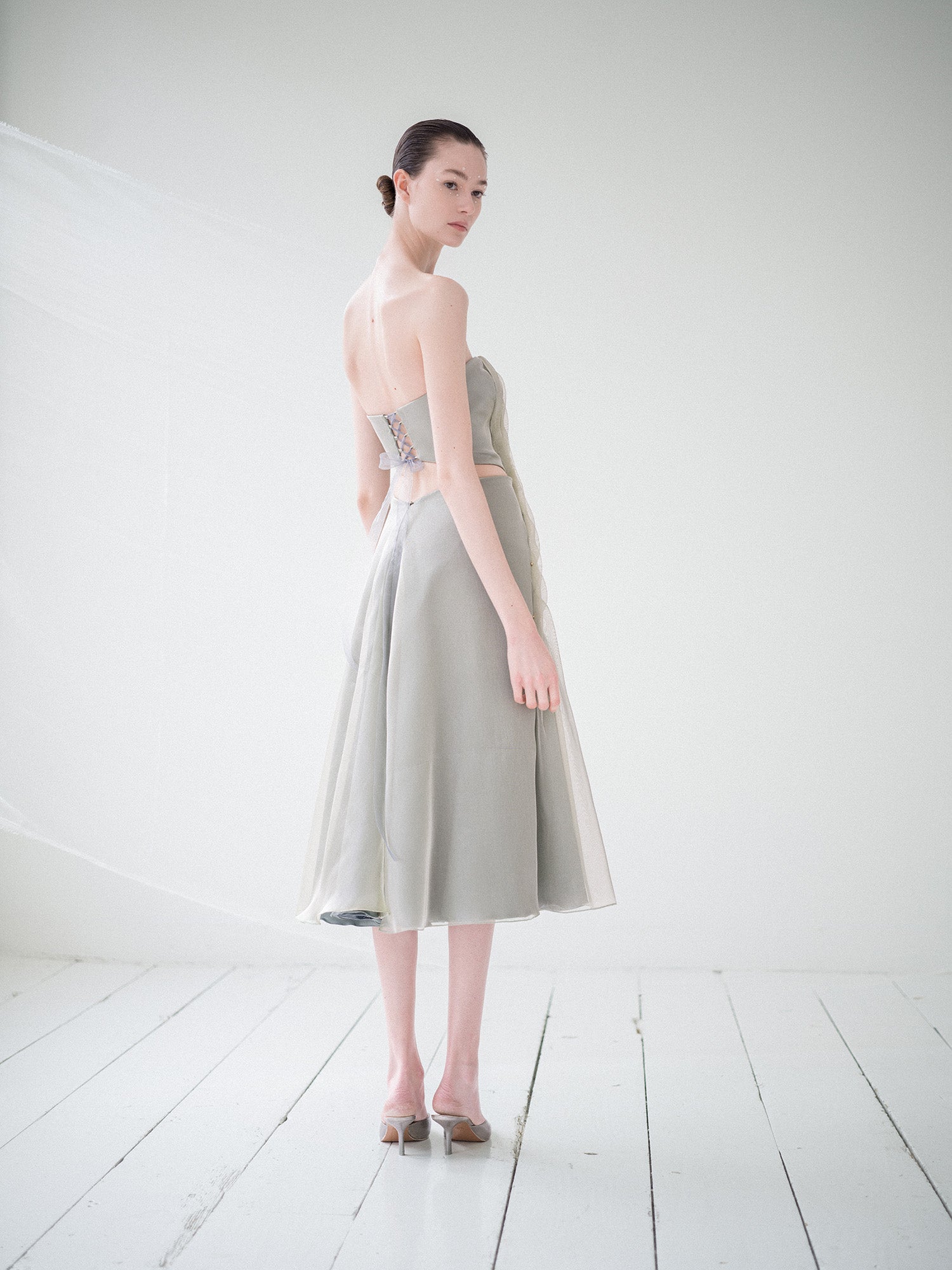Aqua – A timeless A-line dress crafted from three delicate layers: sheer silk organza, a superfine wool base, and a soft viscose lining for added comfort. Hand-stitched detailing along the center front adds a distinctive, subtle elegance. The open back, finished with adjustable laces, offers a flexible fit while enhancing the dress’s graceful silhouette. Light and refined, its airy design evokes effortless femininity.