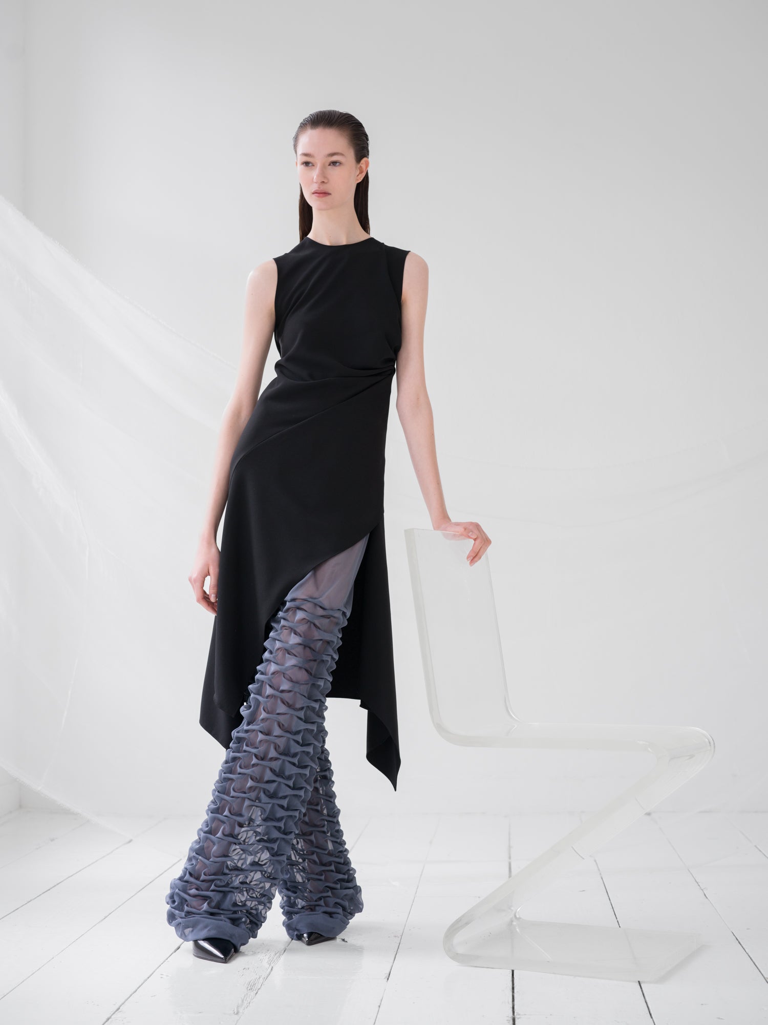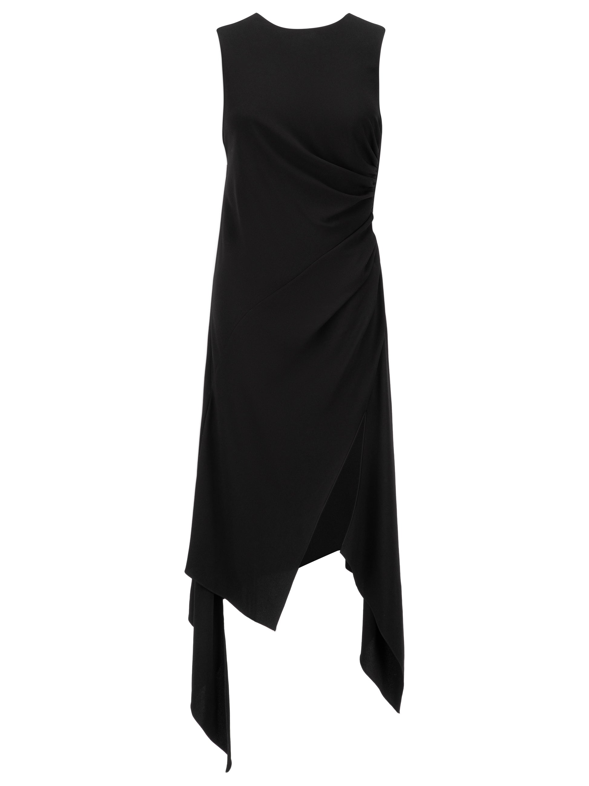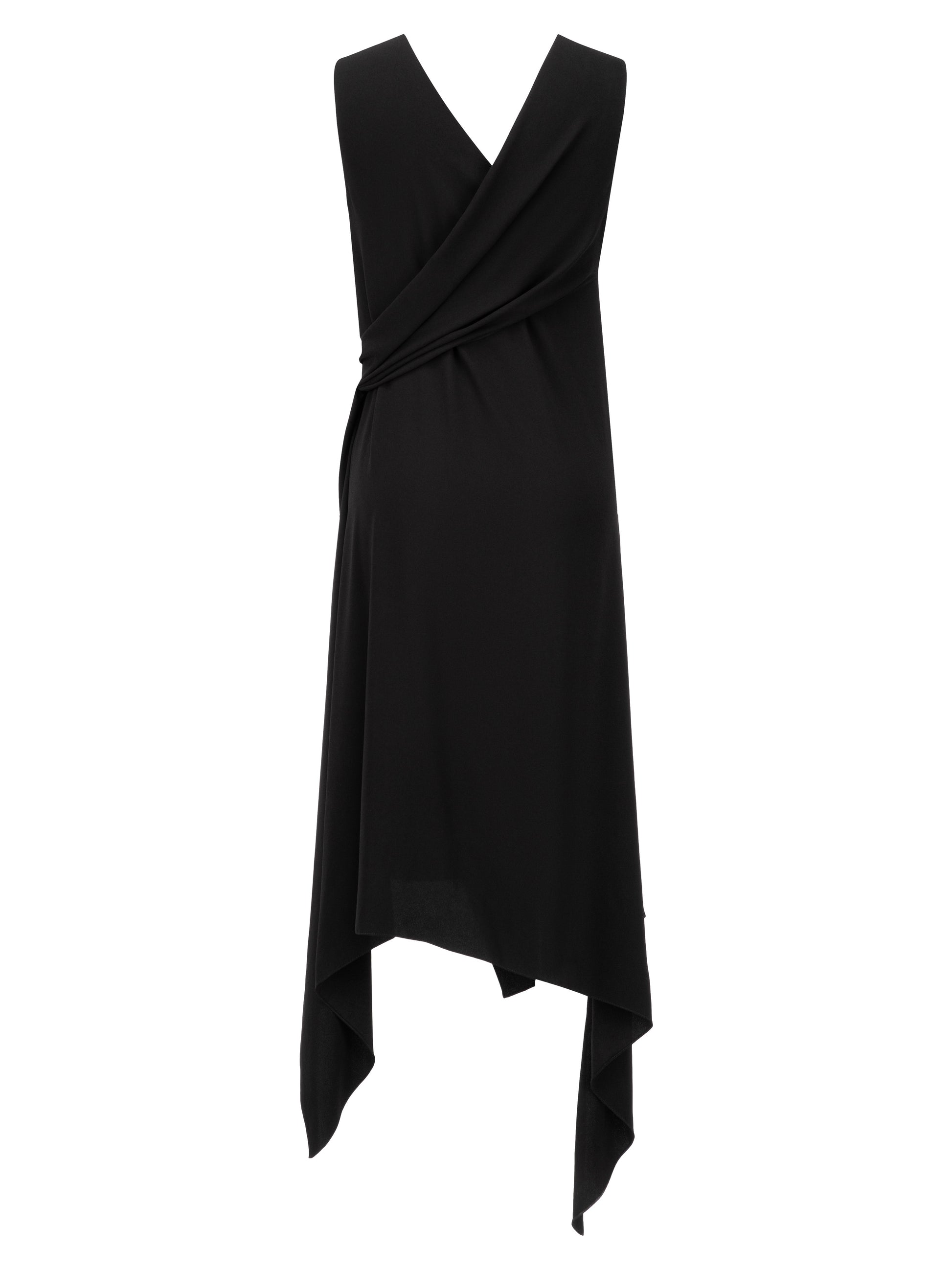 Asymmetry – draped around the body, this dress flows gracefully in triacetate fabric, creating an elegant asymmetrical silhouette.