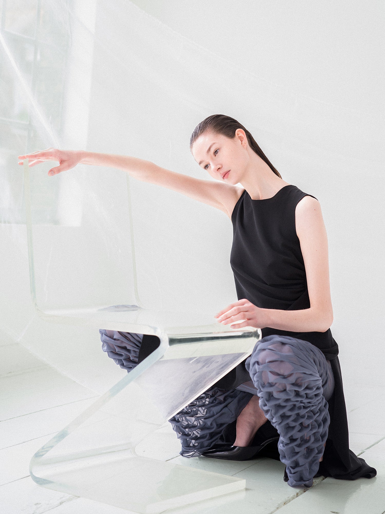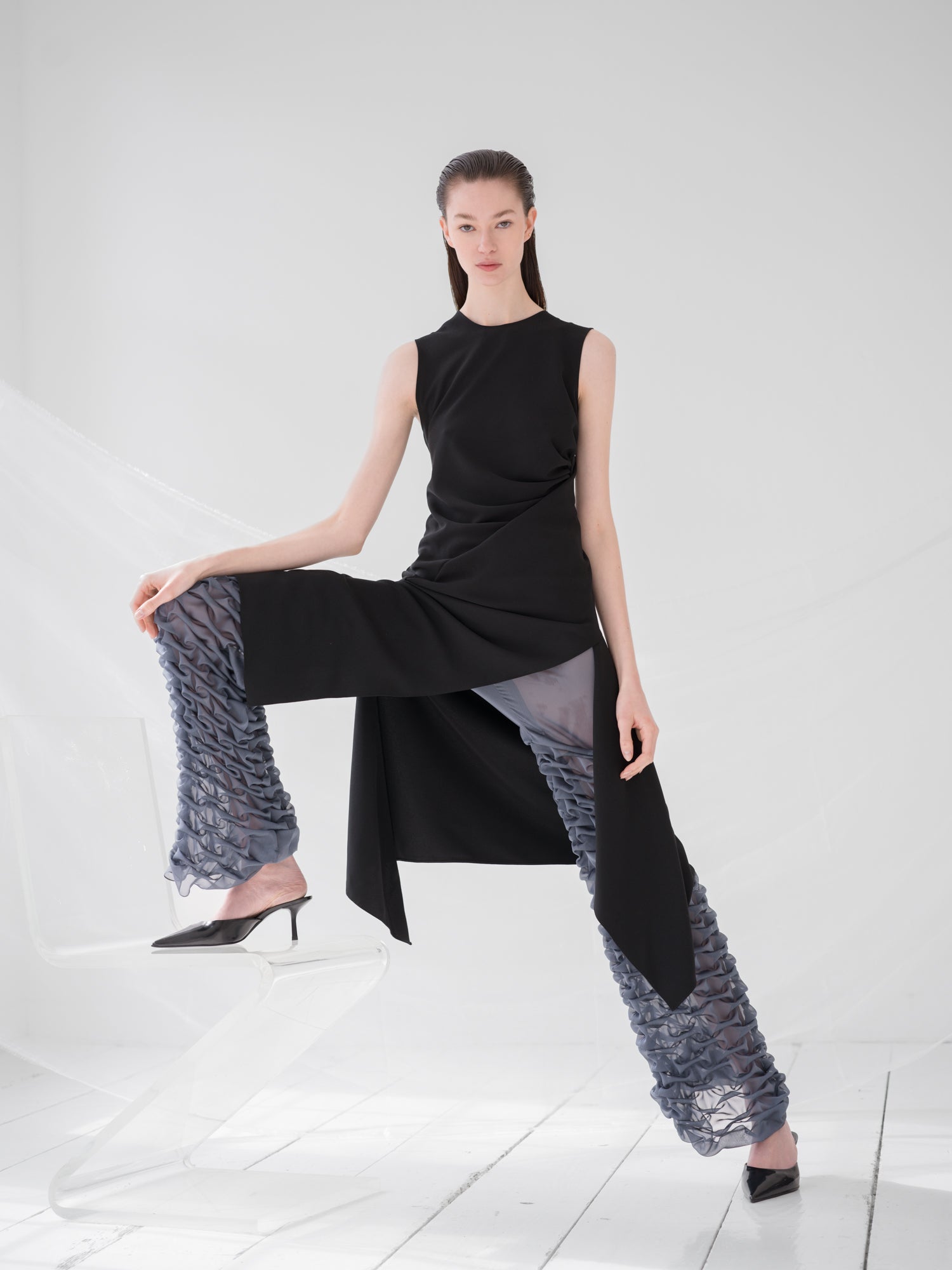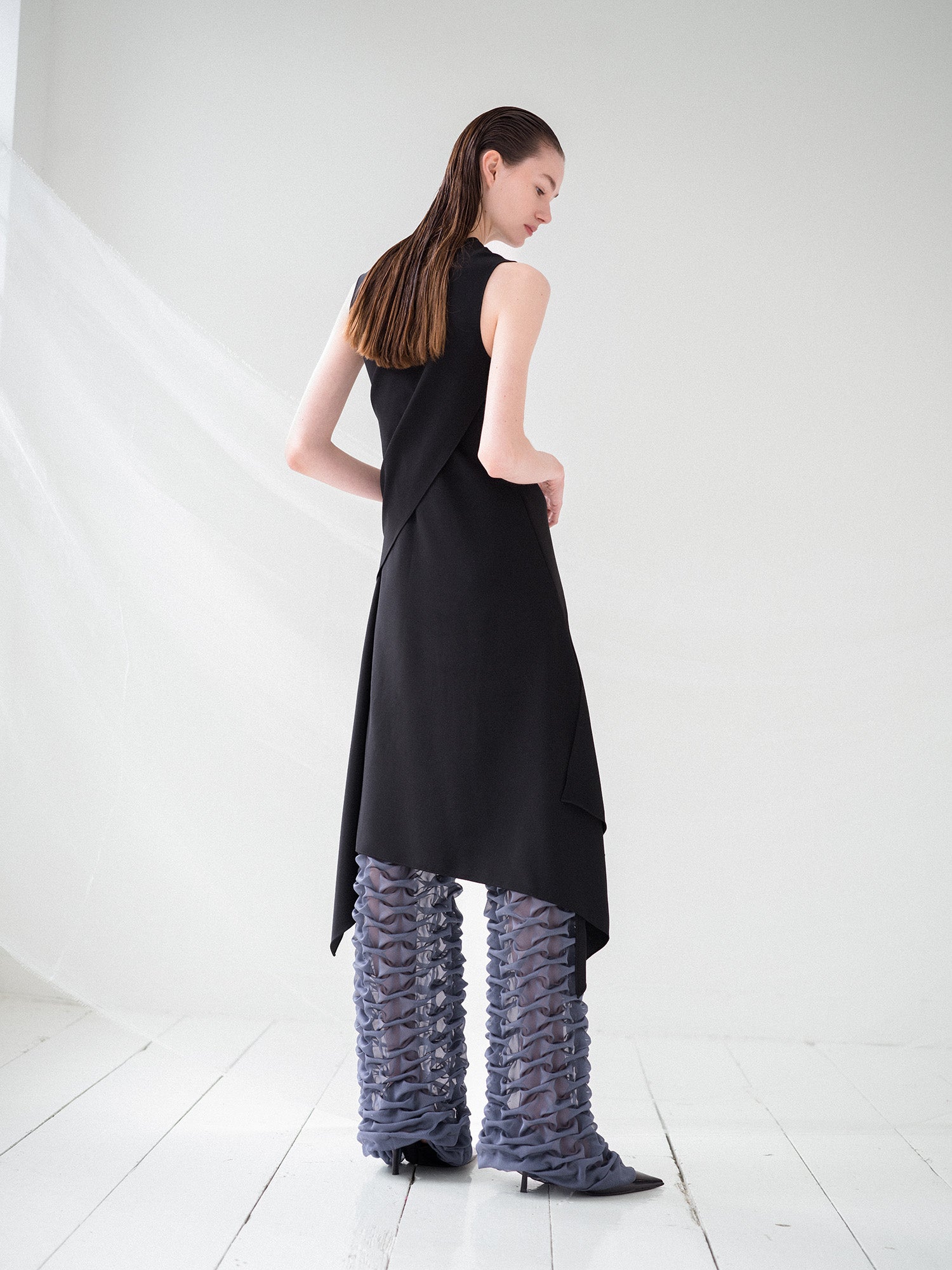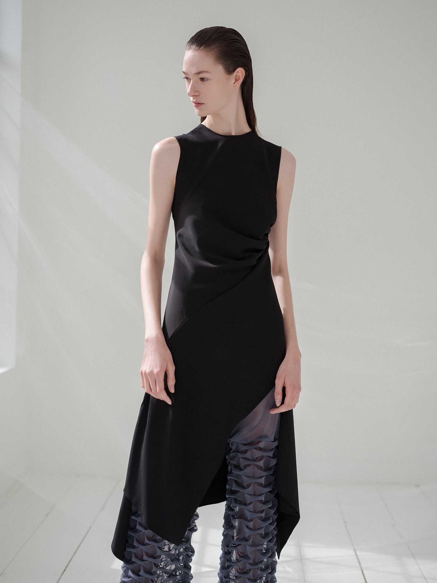 Asymmetry – draped around the body, this dress flows gracefully in triacetate fabric, creating an elegant asymmetrical silhouette.