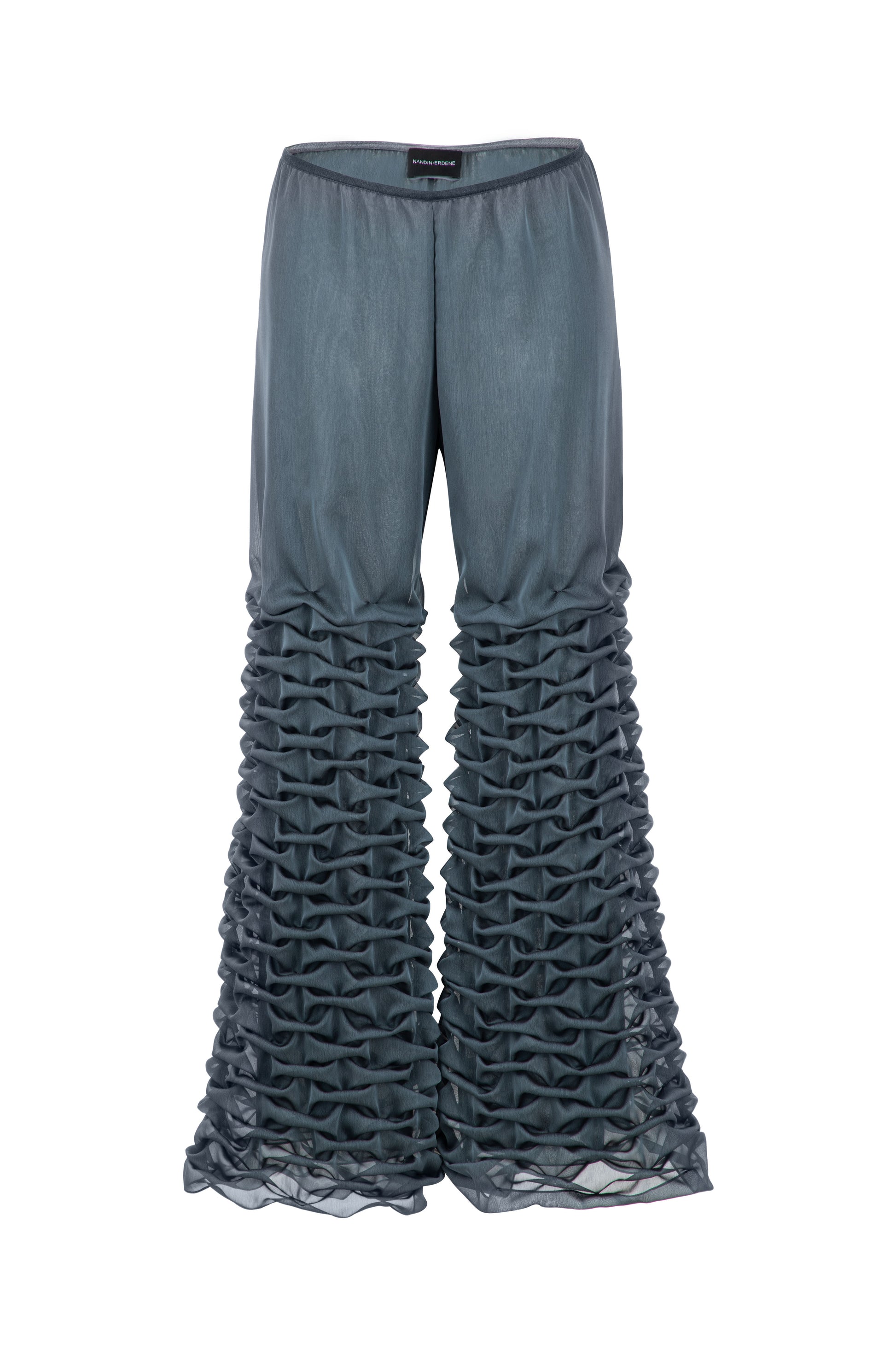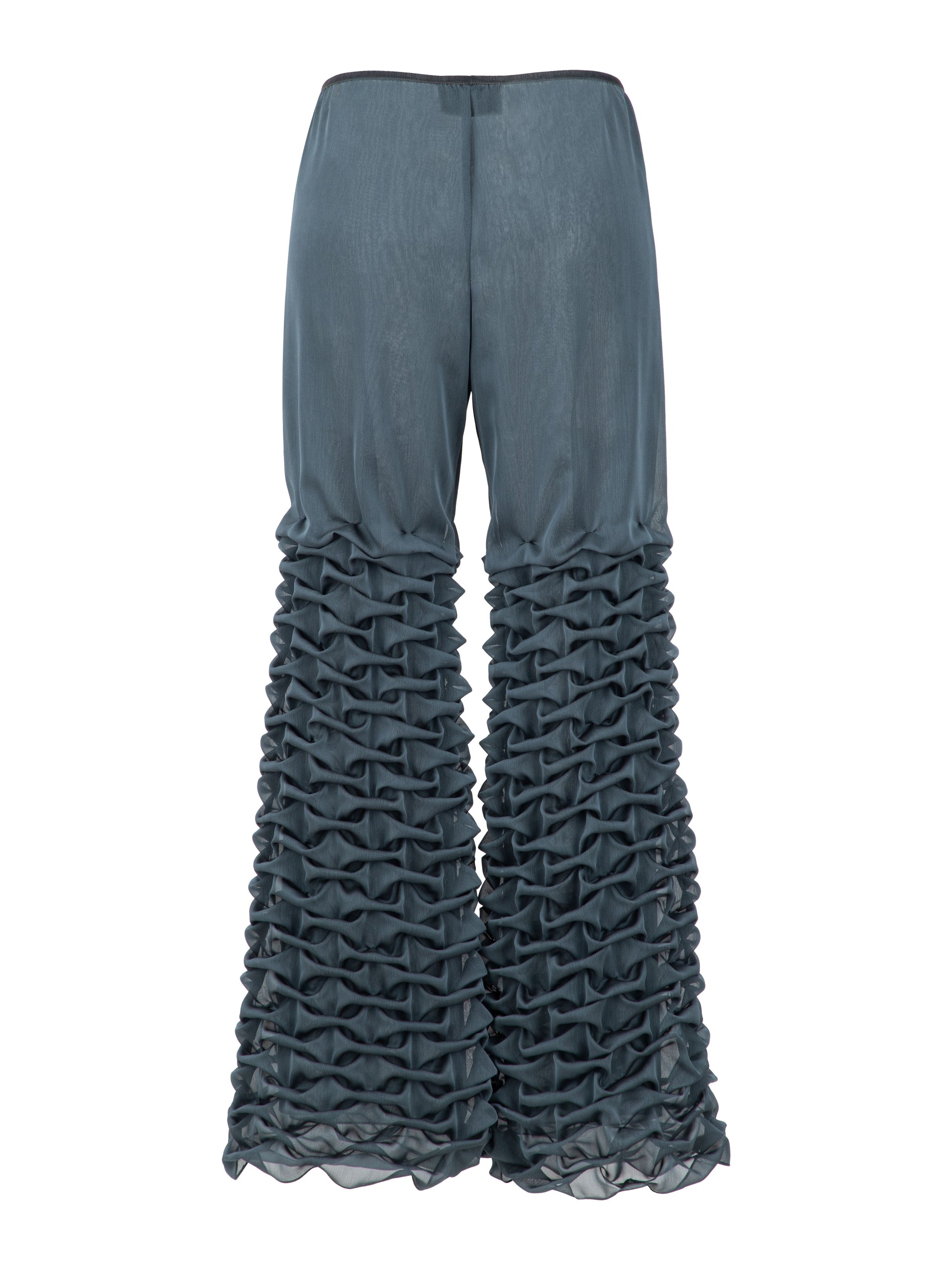 Glassy – wide-leg hand-stitched trousers in airy chiffon, flowing in a soft grey-blue hue with a sheer, weightless feel.