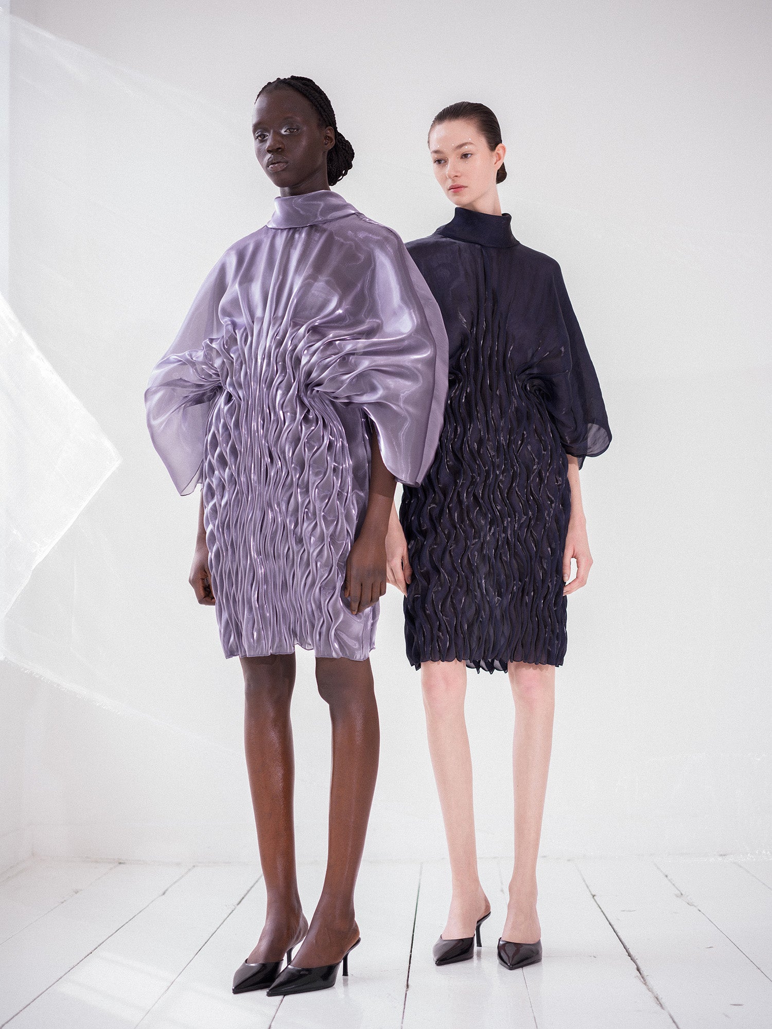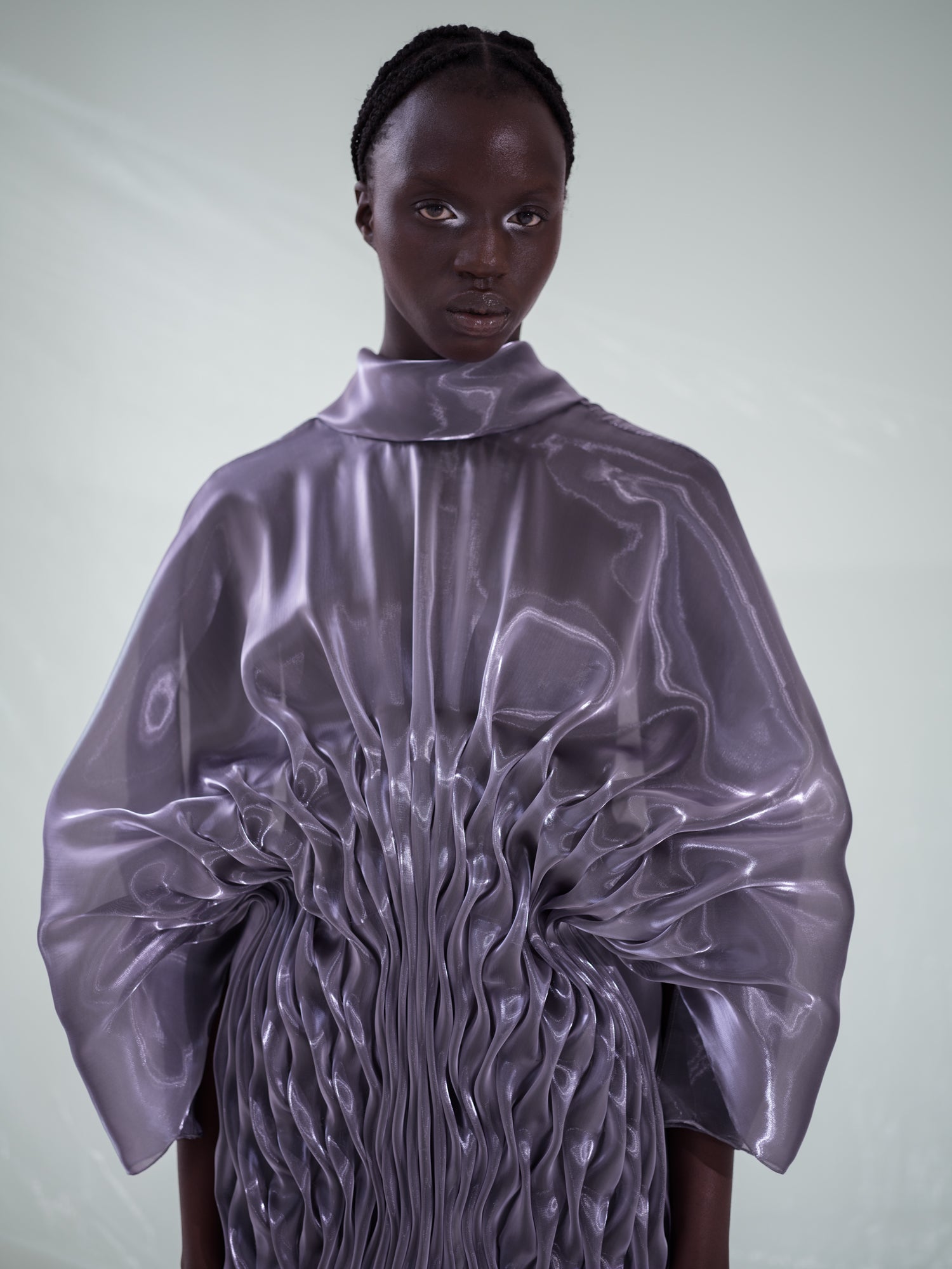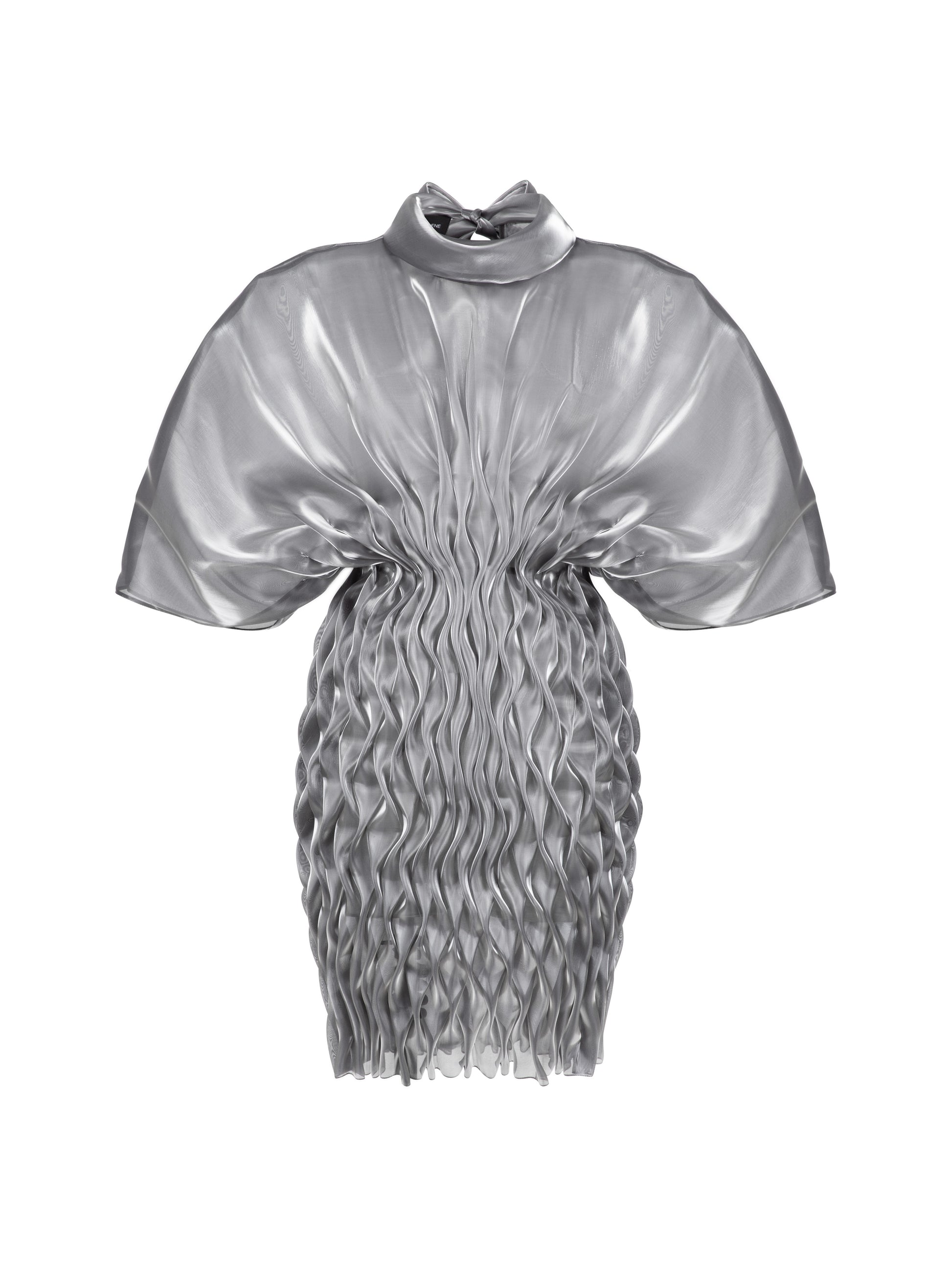 Onda – Inspired by the movement of water, this shimmering organza dress, with each detail hand-stitched one by one, captures fluidity through its luminous waves and sculpted silhouette sleeves