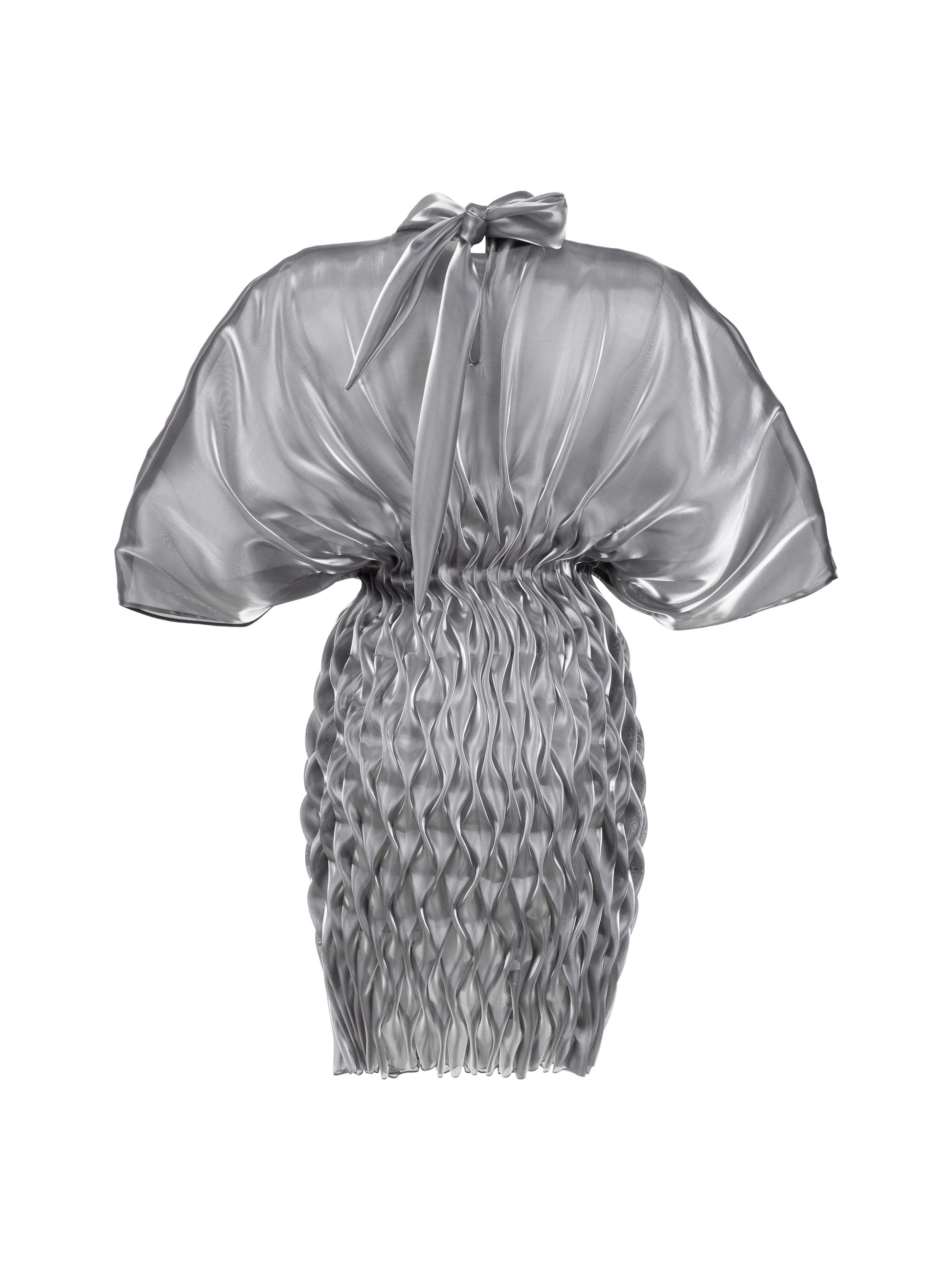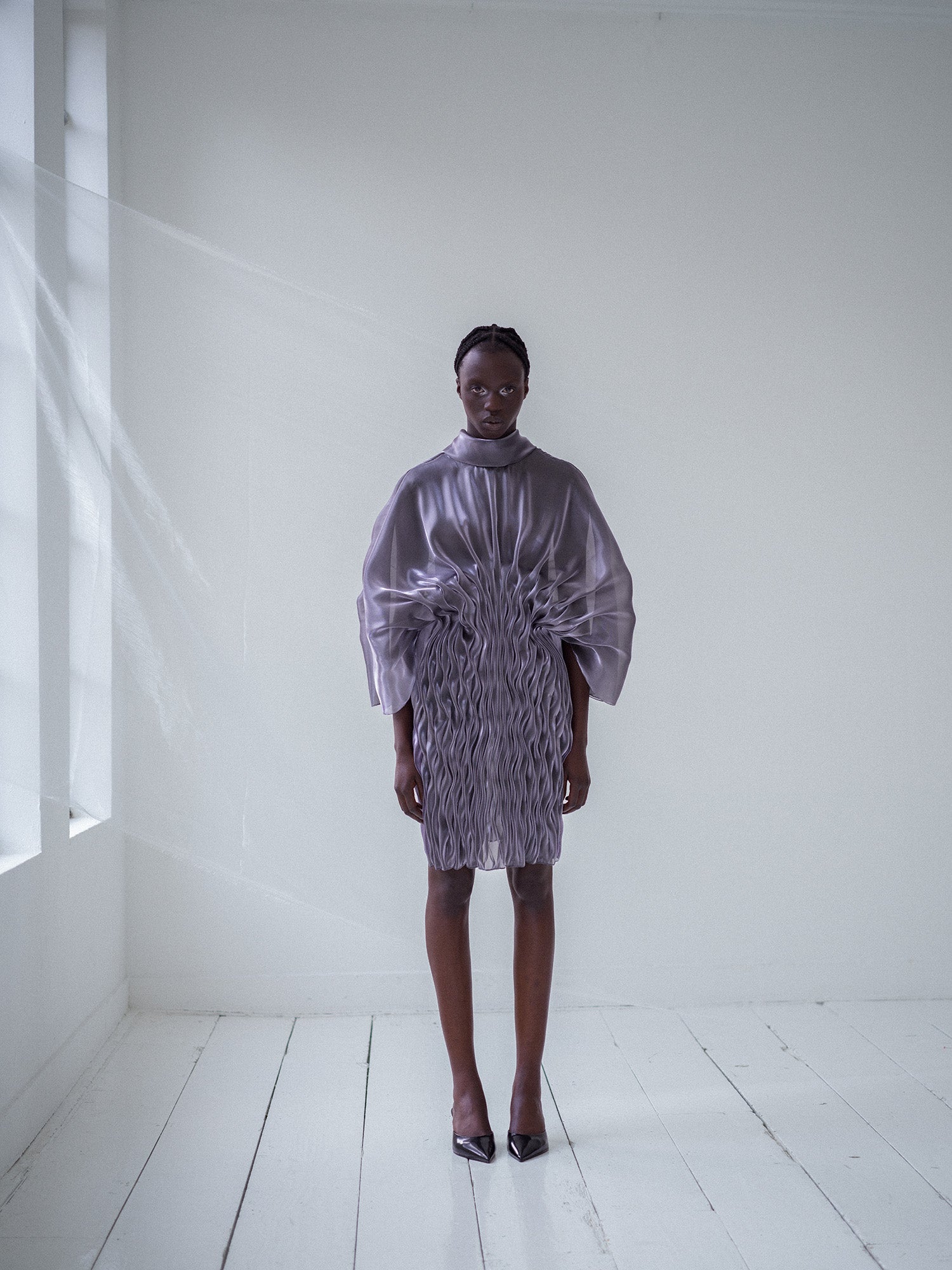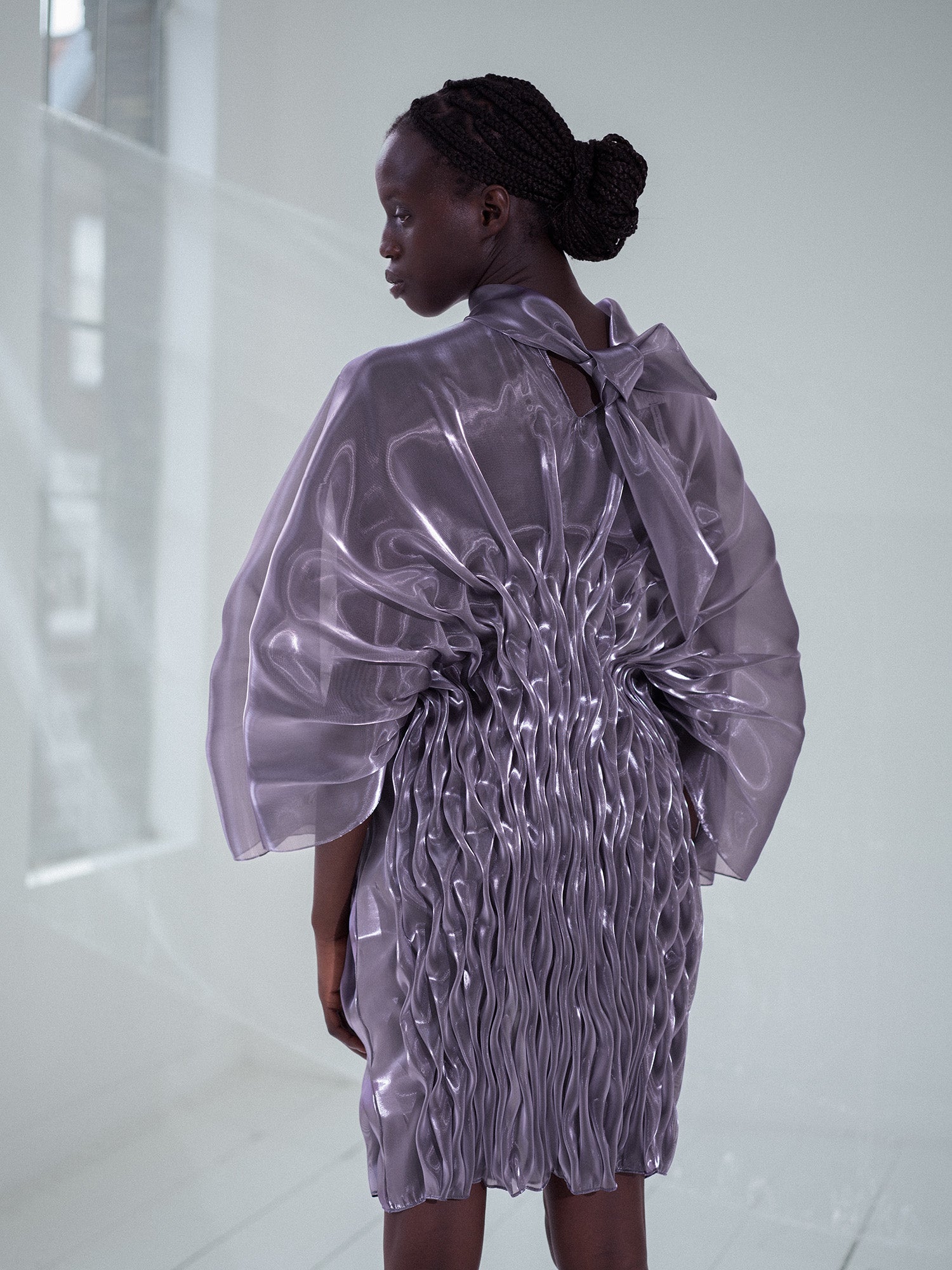 Onda – Inspired by the movement of water, this shimmering organza dress, with each detail hand-stitched one by one, captures fluidity through its luminous waves and sculpted silhouette sleeves
