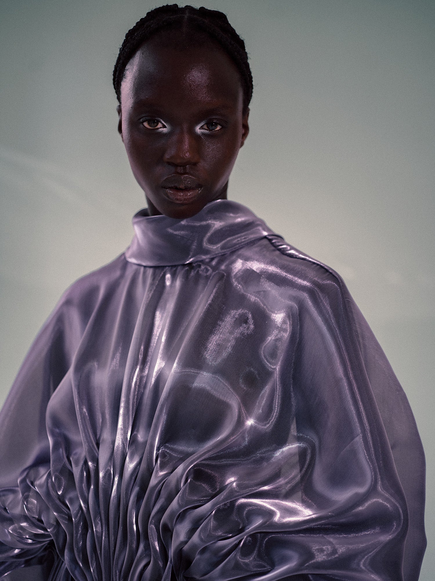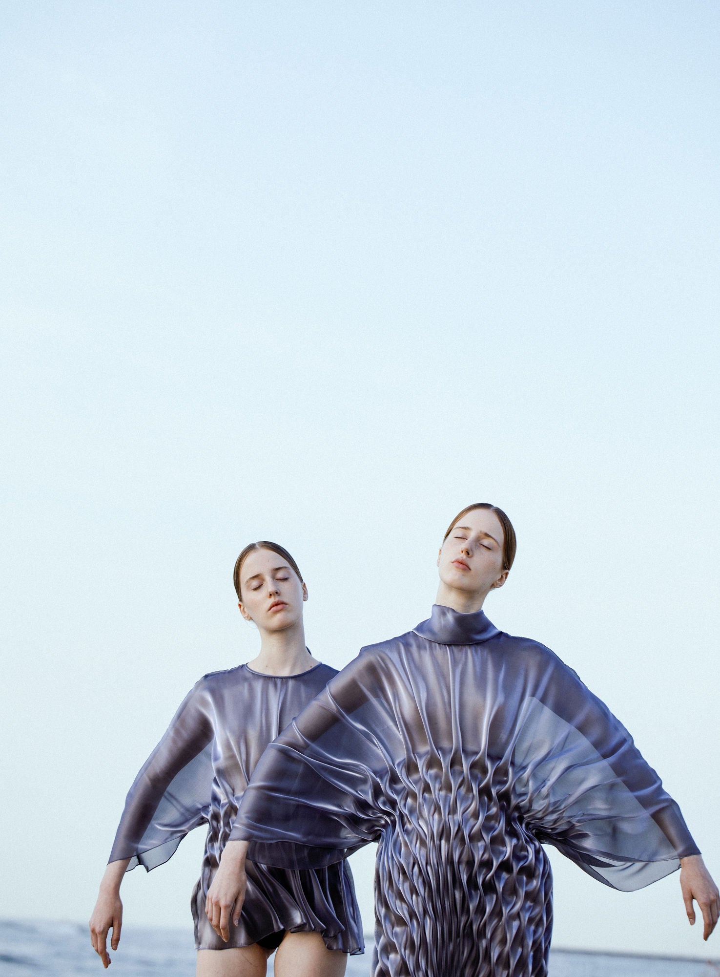The Onda is a study in light and motion. Crafted from a delicate, shimmering lilac organza, this piece features complex, hand-stitched ripples that radiate across the body. The voluminous, sculptural sleeves and high-neck silhouette create a dramatic, avant-garde form that appears to change as it catches the light. As a unique studio version, this lilac edition offers a softer, more ethereal perspective on the collection’s signature "wave" aesthetic.